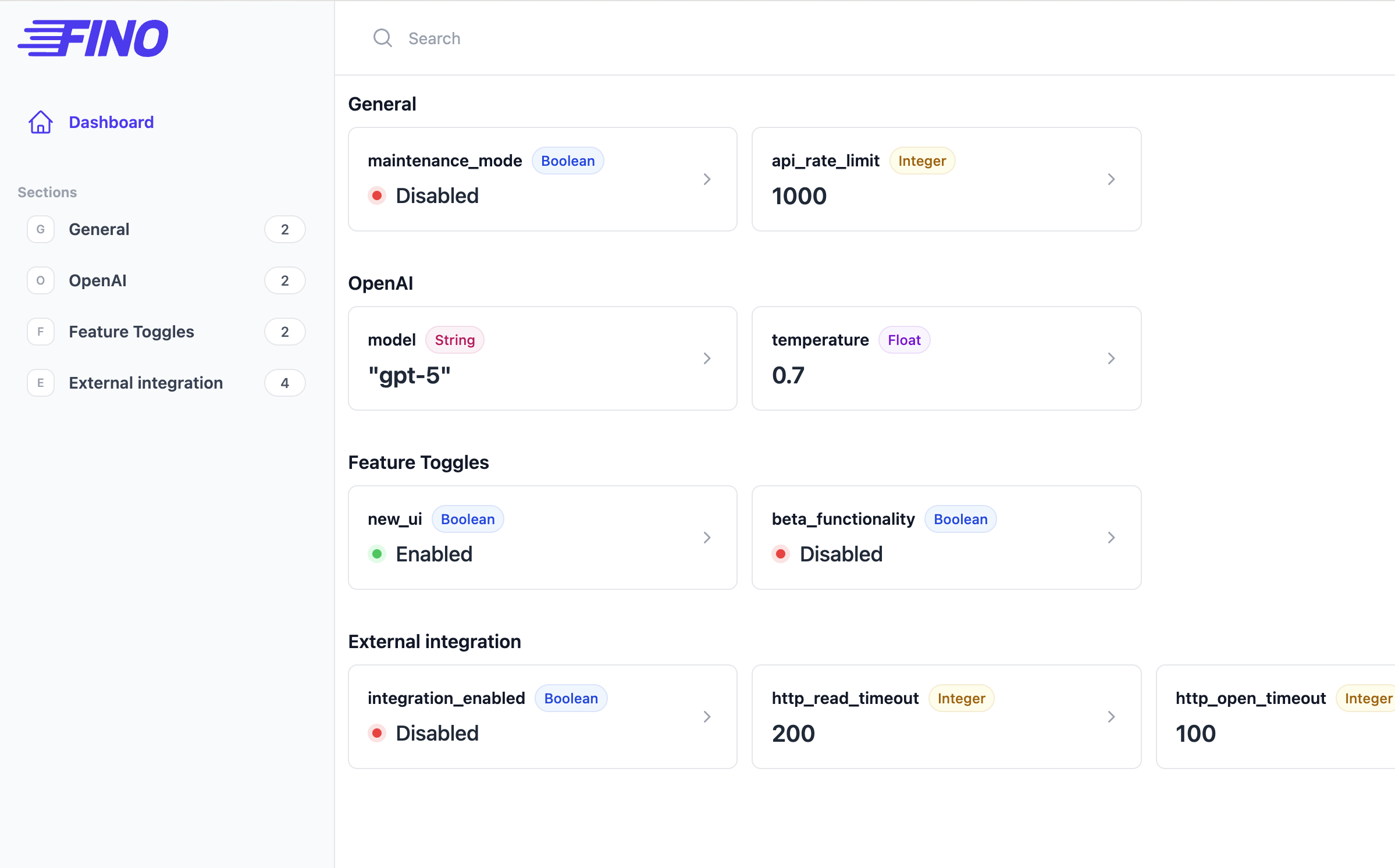 Fino.configure do settings do setting :api_rate_limit, :integer, default: 1000, description: "Maximum requests" section :openai, label: "OpenAI" do setting :model, :string, default: "gpt-4o", description: "OpenAI model" setting :temperature, :float, default: 0.7, description: "Model temperature" end end end Fino.value(:api_rate_limit) # => 1000